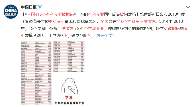 不久前,教育部公布了2018年度《普通高等學(xué)校本科專業(yè)備案和審批結(jié)果》,共計(jì)416個(gè)專業(yè)將被撤銷!