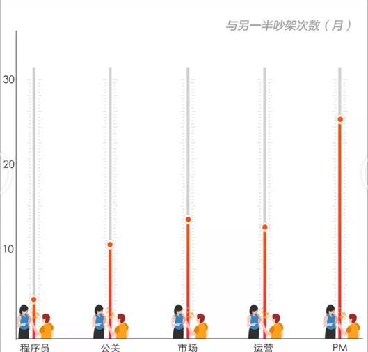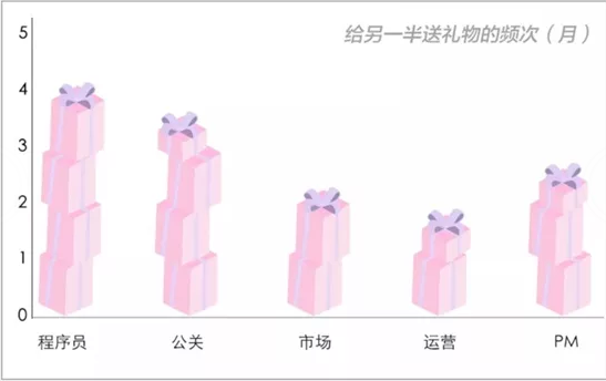 不僅如此,程序員每月與對象吵架的次數(shù)也是最少的(可能是為了高薪加班太多,我已熟睡,你還未歸,我已出門,你還未醒的狀態(tài)造成的吧~),原因可能是,程序員給對象送禮的頻率是最大的(這就是有錢帶來的浪漫,化解一切問題)。