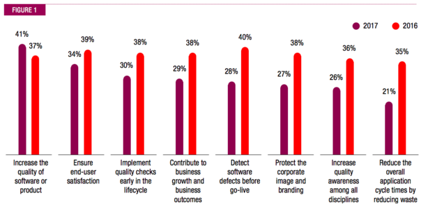 2016年被引用最多的目標(biāo)是在上線前發(fā)現(xiàn)缺陷,這個數(shù)字從40%下降到2017年的28%;
