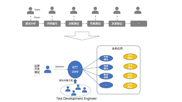 要做到質(zhì)量的實(shí)時(shí)反饋和面向?qū)ο鬁y試,這意味著我們的測試方法和協(xié)同方式發(fā)生了較為根本性的變化。我們需要以一個(gè)合適的方式參與到業(yè)務(wù)應(yīng)用中,與此同時(shí)我們還需要把測試的各種能力封裝成一個(gè)個(gè)服務(wù),而不是現(xiàn)在的工具。工具終究是需要人來操作的,而我們希望未來測試任務(wù)的主體是機(jī)器、算法。測試人員只構(gòu)建測試服務(wù),而不參與測試過程,這也是最符合測試開發(fā) Test Development Engineer 的 job design 。