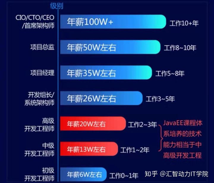 根據(jù)目前各招聘平臺(tái)關(guān)于Java開(kāi)發(fā)工程師崗位薪資統(tǒng)籌顯示,Java初級(jí)開(kāi)發(fā)工程年薪大概在6W左右,Java中級(jí)開(kāi)發(fā)工程師年薪在13W左右,高級(jí)開(kāi)發(fā)工程師的年薪在20W左右。當(dāng)然后期發(fā)展到項(xiàng)目管理層,薪資待遇也會(huì)更高。