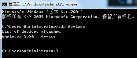 虛擬機啟動后,在cmd窗口中通過adb devices檢查是否成功識別該設備。如圖1-4所示。