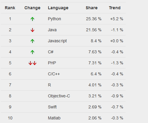 而在另外一份 PYPL 榜單上,Python 在今年 5 月以 22.8% 的份額,首次超越 Java占據(jù)榜首位置。隨后幾個(gè)月 Python 保持上漲趨勢(shì)以 23.59% 的份額甩開(kāi) Java ,排名第一,正逐漸與 Java 拉開(kāi)差距。最新榜單如下: