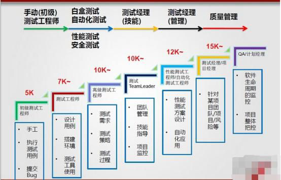可見,選擇軟件測試這個朝陽行業(yè)的朋友,做了一個比較正確的選擇!下圖是軟件測試工程師的職業(yè)發(fā)展示意圖: